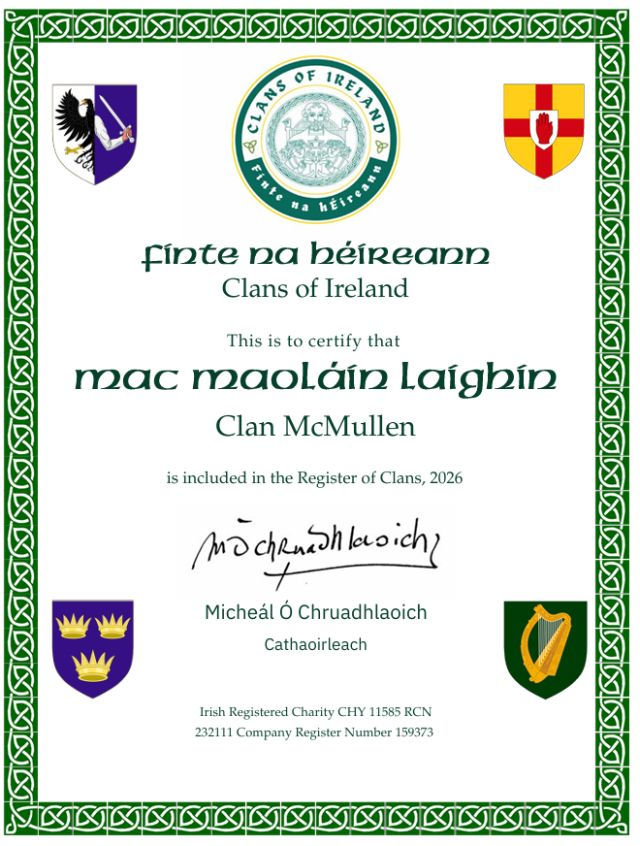 Clan McMullen Leinster "Mac Maoláin Laighin " is an association based in the “Republic of Ireland” and registered with Ireland's officially recognized Clans of Ireland “Finte na hÉireann”  (click on individual tabs above to review clan research topics).