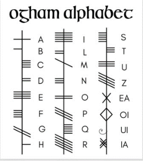 The name Ogham is derived from Oghma, the Celtic God of elocution . Ogham comprises a set of twenty or so letters of the Latin alphabet, transcribed into incisions and notches made on the corner edge of a quarried slab of stone. A key to its translation was discovered in a medieval religious text. This marked the first time that Irish was written down. Using this translation key, it is possible to read the Ogham script, from the bottom of the stone up.