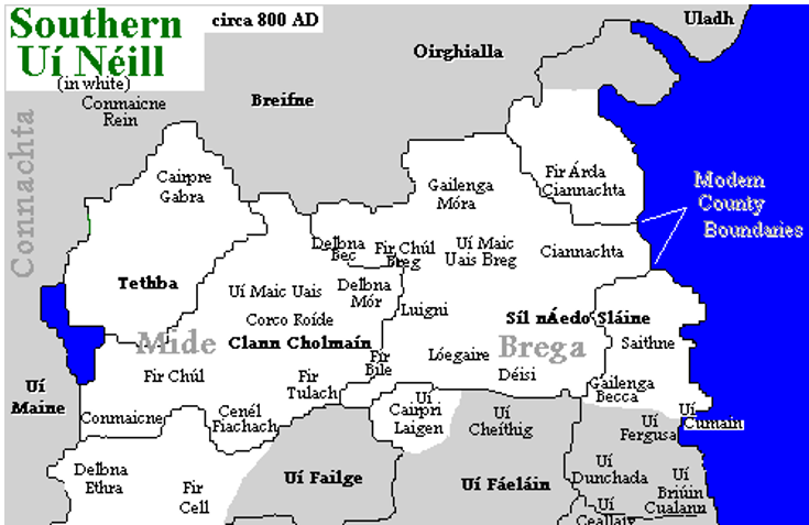 Authors note: Locales of Mide and Brega during the dynastic era of Clann Cholmain and Sil nAedo Slaine (Mael Seachlain kings of Mide (Westmeath) and Tara (Brega) circa 800AD, are illustrated on the map below. This contributes to an understanding of how modern day county Meath (Irish Mide) was then referenced as "Brega", and county Westmeath then referenced as "Mide" (Meath).